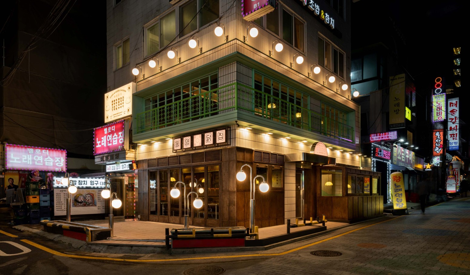 동명닭집은 직접 끓여 낸 육수와 특제 양념을 기반으로 한 닭요리 전문점입니다.   2014년 4월, 경기도 안산에서 ‘셰프스 라운지’라는 양식 레스토랑 작업을 했습니다. 어쩐지 기억에 남는 프로젝트 중 하나인데요. 좋은 인상을 가진 건 우리만이 아니었나 봅니다. 10년이 지난 어느 날, 당시 막내 직원이었다며 연락이 왔습니다. 안산에 ‘동명닭집’이라는 브랜드를 운영 중인데 서울 논현점을 의뢰하고 싶다고, 꾸준히 팔로업 해왔다고요.각별한 마음으로 시작했지만 해법이 쉬이 보이진 않았습니다. 브랜드 확장 차원의 프로젝트였는데 브랜드명과 컨셉, 아이템, 그리고 공간이 기존 문법과 차이를 보였기 때문입니다. 논현역 먹자골목은 또 차원이 다르기도 했죠.기존 브랜드는 홍콩 색채가 강했습니다. 여쭤보니 닭이라는 재료를 먼저 결정했는데, 스터디 과정에서 닭을 가장 많이 소비하는 나라가 홍콩이라는 사실을 알게 됐다고 합니다. 차별화 과정에서 색다른 결정을 내린 거죠.문제는 아이템이 굉장히 한국적이라는 점입니다. 메뉴를 자세히 보면 더 그렇습니다. 닭볶음탕, 초계국수, 통닭 등이거든요. 이 괴리를 어떻게 좁힐까 하다가 레트로한 한국식 주점에 기존 ‘동명닭집’의 홍콩스러움을 절묘하게 믹스한 형태를 기획했습니다.‘확장 차원의 브랜드를 어떻게 보여줄까?’‘어떻게 설득력 있는 공간을 만들까?’초기 기획은 하나의 스토리텔링에서 시작했습니다. 요컨대 ‘홍콩에서 매장을 구한 한국인 사장님이 태극기 걸고 인테리어 조금 해서 운영하는 한식당’입니다. 홍콩 컨셉을 설득력있게 만들기 위한 스토리가 갖춰지자 구체적인 방향이 보이기 시작했습니다. 우선, 큰틀에서는 홍콩스러워도 된다는 판단이 들었습니다. 한국 사람이 홍콩에서 장사하는 컨셉이니까요.홍콩 컨셉은 파사드에서 구현하기로 했습니다. 먹자골목이라 시선을 사로잡아야 하는 과제도 있었기 때문에 조명부터 밝게 했습니다. 2층에는 홍콩의 빼곡한 아파트를 모티브로 화려한 디자인을 했습니다.레트로 감성을 위해서는 직사각 타일을 주요 마감재로 썼습니다. 특히 신경 쓴 부분은 메지(눈줄)입니다. 레트로한 한국식 주점을 지향하는 만큼 간격을 넓게 두고 타일을 붙인 겁니다. 옛날 주택이나 백화점, 지하철 등에서 이런 시공을 많이 했기 때문에 사람들이 은연중에 예스러움을 느끼는 포인트죠. 다만 이 디테일을 1층 외부에는 쓰지 않았습니다. 1층 만큼은 진입 장벽이 낮아야 한다고 판단해서입니다. 아이템, 그리고 5060까지 연령층이 넓은 기존 매장 특성을 고려하면 절제가 필요했죠. 그래서 한 선택이 합판과 진한 스테인 마감입니다.내부도 큰 틀은 같습니다. 홍콩 컨셉이지만 과하지 않게 공간을 꾸몄습니다. 어폐가 있는지 모르겠지만, 인테리어를 신경 써서 한 듯 안 한 듯 연출했습니다. 홍콩과 한국의 중간, 레트로와 모던의 중간, 퀄리티와 러프의 중간. 그 절묘한 비율을 찾아가는데 특히 유념했습니다. 홍콩스러운 소재와 소품을 엄선해 쓰면서도 한쪽 벽을 미장 후 페인트칠을 거칠게 하는 식입니다.보여주고 하는 것이 여러 개라는 뜻은 결국 한 공간에 다 섞여야 한다는 의미입니다. 이때 산만해 보이지 않는 것이 중요합니다. 각각이 적절히 존재감을 드러내야 하죠. ‘동명닭집’ 프로젝트에서는 나름대로 설득력을 갖추기 위해 최적의 비율을 고민하며 공간을 마무리했습니다.