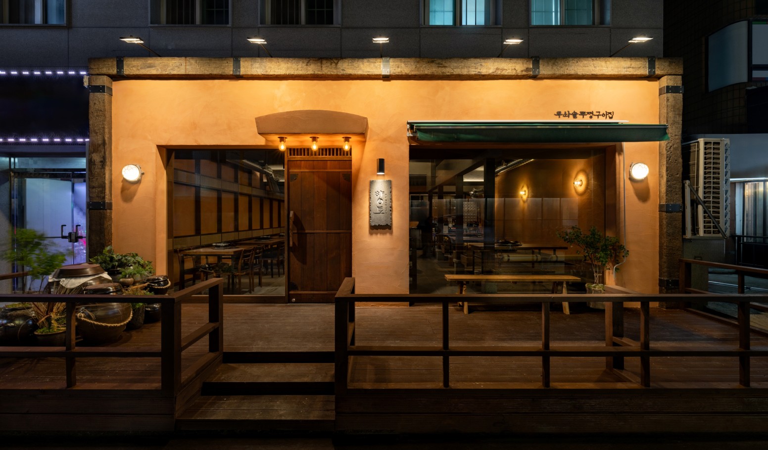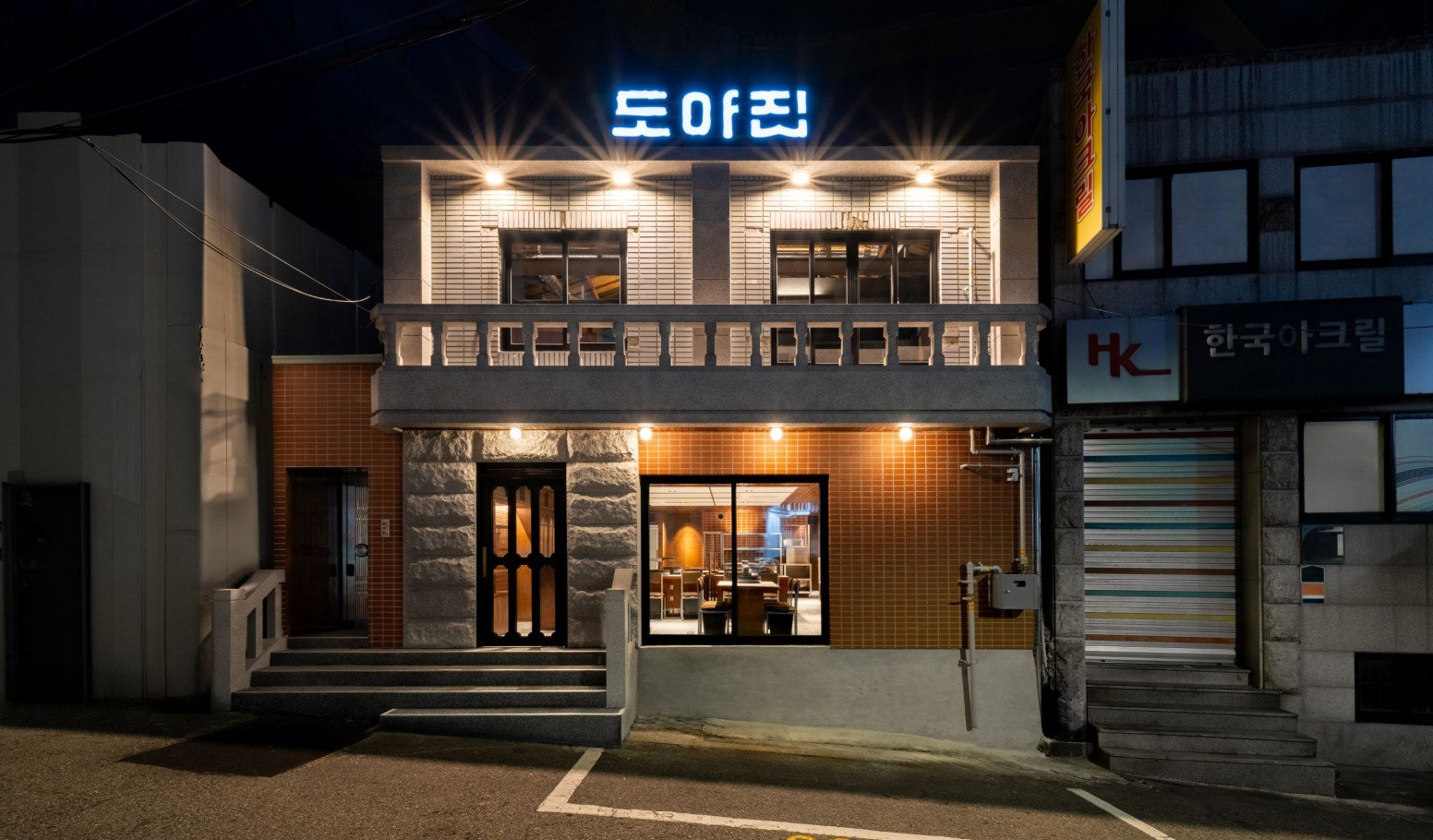 도야집은 용리단길에서 시작된 돼지고기 전문점입니다. 을지로점은 내 집 같은 편안한 공간을 지향합니다.  용리단길 부흥을 이끈 대표 맛집 ‘도야집’의 새 지점을 의뢰받았습니다. 브랜드 정체성을 유지하면서 새 터인 을지로와 어울려야 했고, 어느 정도 퀄리티도 기대하는 상황이었습니다. 또 하나의 미션은 오래된 인쇄소 건물을 효과적으로 사용하는 것이었습니다. 살릴 건 살리고 버릴 건 버려야 했죠. 그런 고민 속에서 프로젝트를 진행했습니다.‘브랜드 정체성을 유지하면서 또 어떻게 다르게 할까?’‘오래된 건물을 어떻게 사용할까?’‘도야집’의 가장 중요한 정서는 집입니다. 요즘 F&B 공간은, 특히 고깃집은 전반적인 정서를 레트로 컨셉으로 보여주곤 합니다. 향수를 불러일으키니까 고깃집에서 사용하기 좋죠. ‘도야집’도 그 연장선에 있습니다. 하지만 조금 다릅니다. 90년대 집을 너무 복고풍으로 보여주지 않는 방향이라고 할 수 있습니다. 컨셉이 레트로가 아닌 90년대 집인 거죠. 컨셉을 직관적으로 느낄 수 있는 장치로 익스테리어를 활용했습니다. 기존 인쇄소 건물을 집처럼 보이도록 석재 난간을 만들고, 출입문에는 90년대 쓰이던 현관문을 그대로 달았습니다. 현관문 주변은 포천석을 거칠게 마감해 보다 예전 주택처럼 보이게 했습니다. 2층 올라가는 입구에는 옛날 대문을 사용했습니다. 그 옆엔 명패를 달았는데, 전문가에게 의뢰해 주소까지 제대로 적었습니다.외관을 완전히 뜯어고치지는 않았습니다. 외벽과 창틀은 기존 건물 그대로입니다. 시간의 흐름을 보여주는 게 더 설득력 있다고 판단했기 때문입니다. 주 마감재는 적벽돌 타일입니다. 외관은 물론 내부에도 따뜻한 느낌을 주기 위해 적극 활용했습니다. 이때 타일은 그대로 사용하기 보다 절반으로 일일이 커팅해 붙였습니다. 최근 생산되는 타일은 가로로 날렵한 형태라 그대로 붙이면 90년대 집처럼 보이지 않기 때문입니다. 가로가 다소 짧은 형태는 그 자체로 은근히 예스럽게 느껴집니다.1층 내부는 고깃집답게 마감했습니다. 가장 큰 특징은 천장의 우드 루바입니다. 낮은 층고를 장점으로 승화하고자 한 선택인데, 동시에 광을 많이 내서 90년대 감성이 은근히 느껴집니다. 천장 중앙부는 옛날 거실 천장 디자인을 차용해 화이트 계열 도장으로 마무리했습니다. 바닥은 실용성과 디자인을 다 잡기 위해 콩자갈을 택했습니다. 미감이 좋아 카페에서 많이 쓰이는 마감재로, ‘도야집’에서는 콩자갈에 시멘트를 부은 콩자갈 충진 몰타일 시공을 했습니다. 이렇게 하면 빈티지하게 보이면서도 퀄리티가 느껴집니다.옛날 집 감성은 수납장, 액자, 블록 유리 등 크고 작은 소품과 자재로 드러냈습니다. 특히 수납장은 우드와 고박 유리(무늬 유리)로 제작되어 무척 예스럽습니다. 2층은 본점을 거의 재현하는 데 집중했습니다. 카운터 뒤 본점 이미지와 브랜드 스토리까지 더해 ‘도야집’의 헤리티지가 느껴지도록 마무리했습니다.